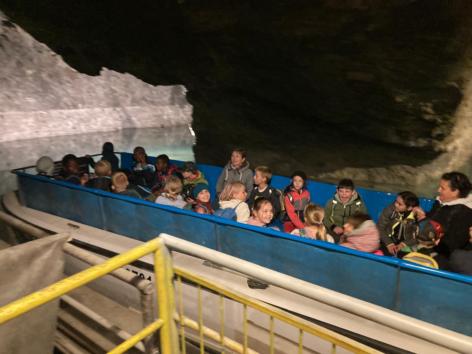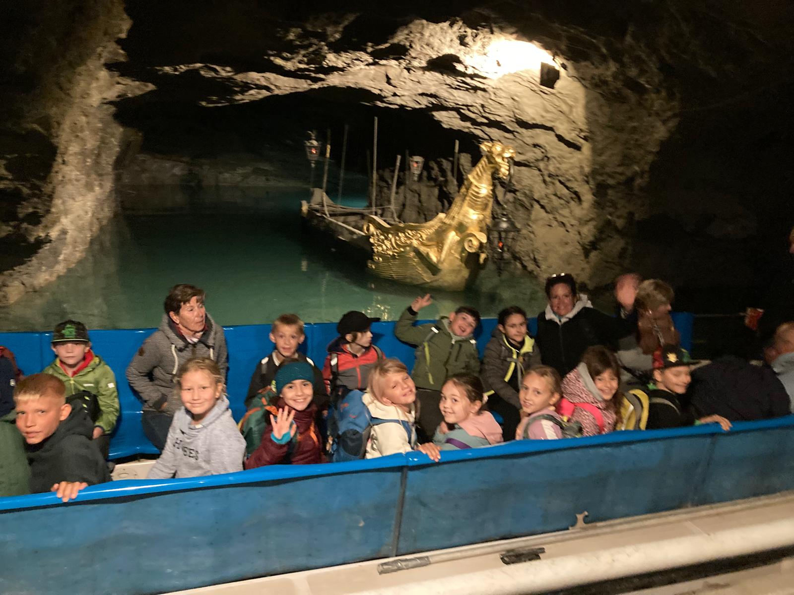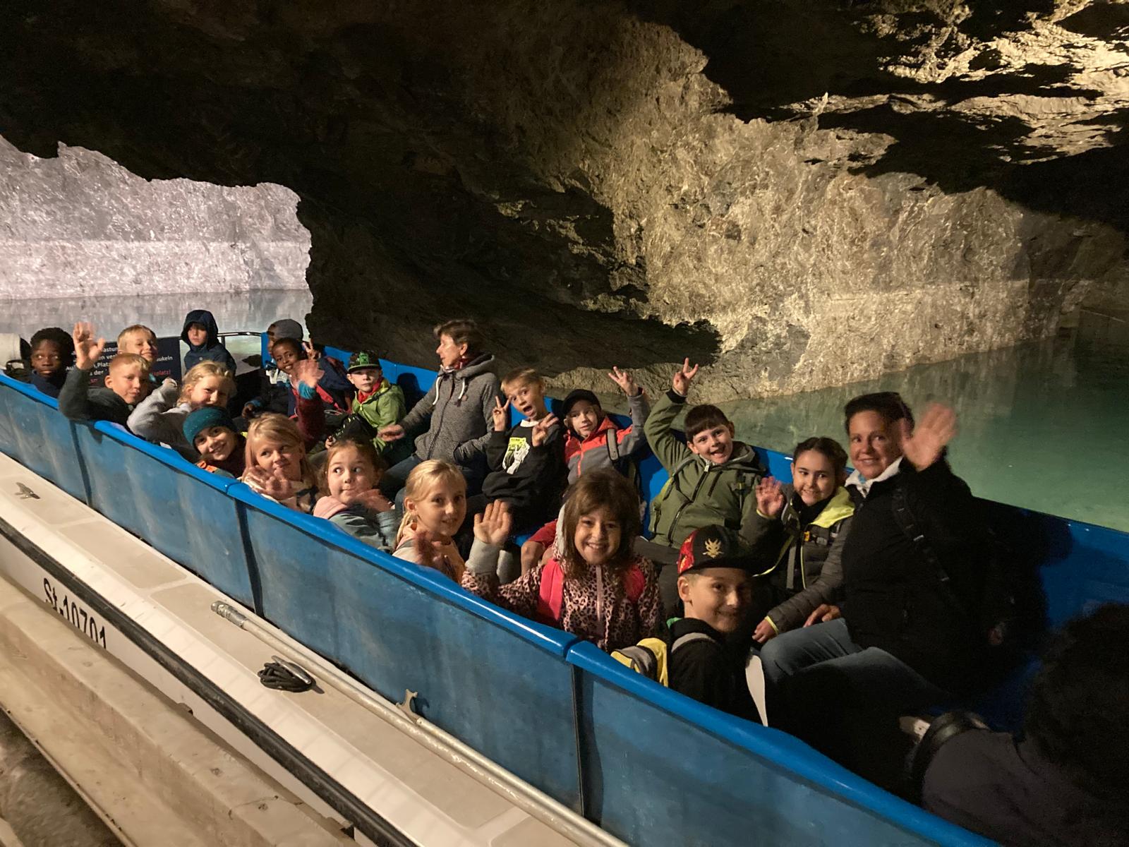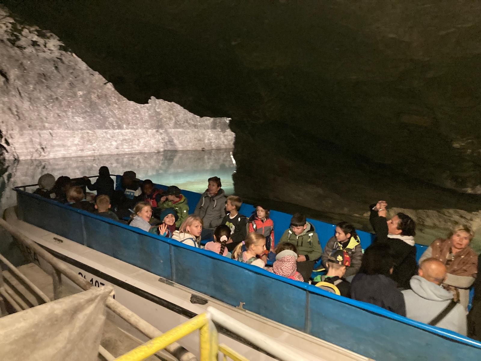 Bei angenehmem Herbstwetter marschierten wir über den Kalenderberg los. Bei der Seegrotte wurden wir Kinder der 3a und 3c bereits erwartet. Zuerst mussten wir einen langen Gang in den Berg spazieren. Es wurde immer kälter und wir waren froh, dass wir warme Jacken und Hauben dabei hatten. Es war auch sehr beeindruckend zu sehen, unter welchen Bedingungen damals die Bergleute, aber auch Pferde arbeiten mussten. Manche Tiere bekamen das Tageslicht nie zu sehen. Das absolute Highlight war natürlich die Bootsfahrt auf dem unterirdischen See.
