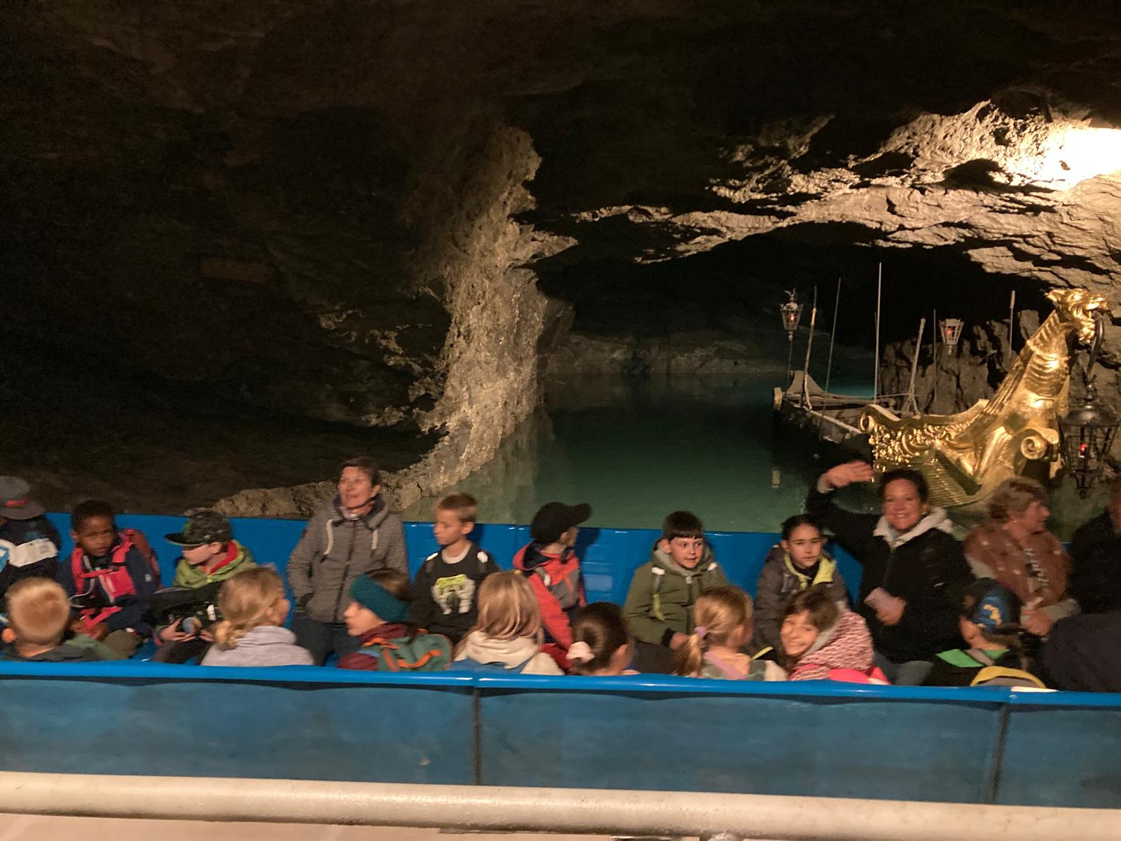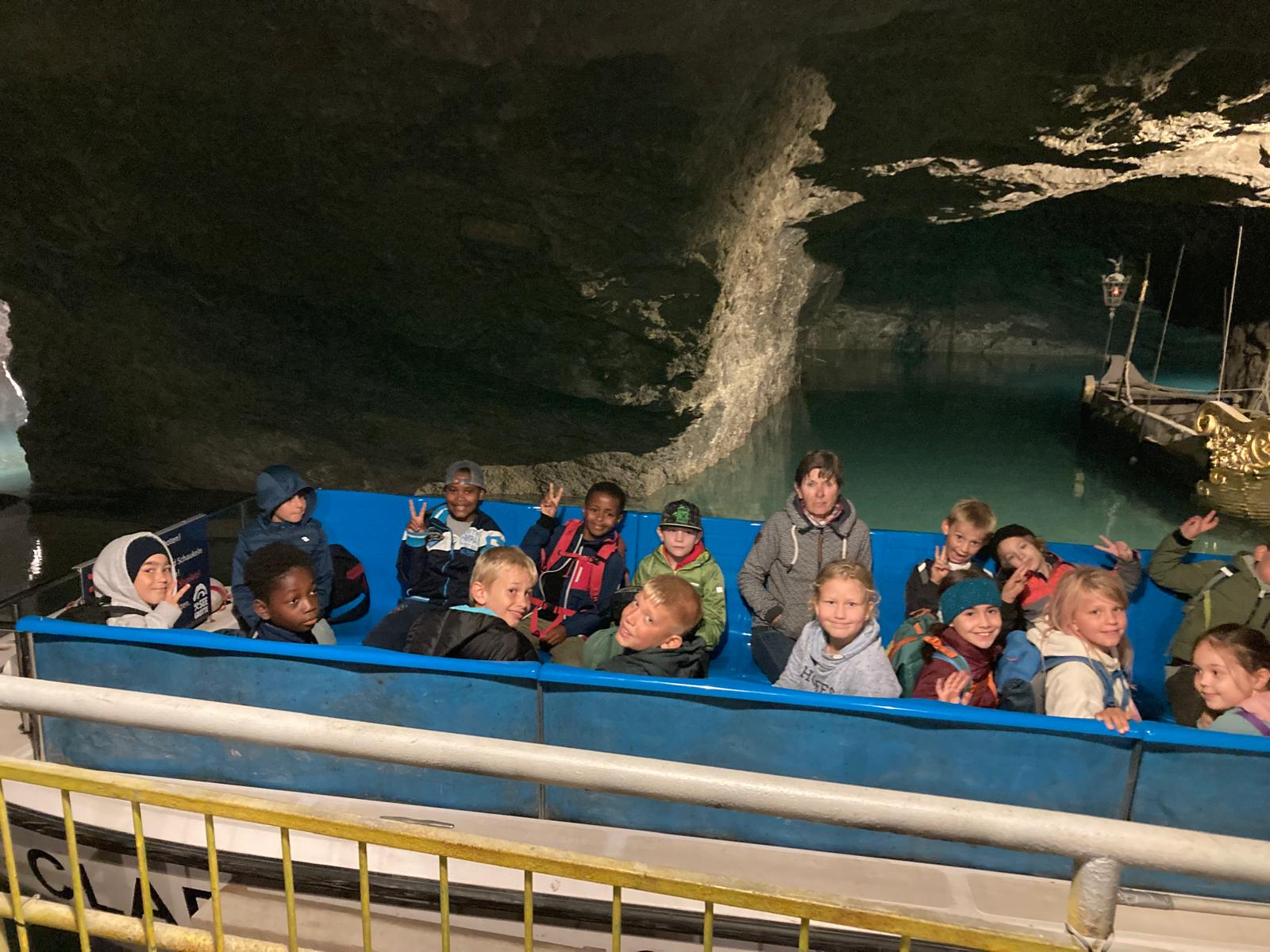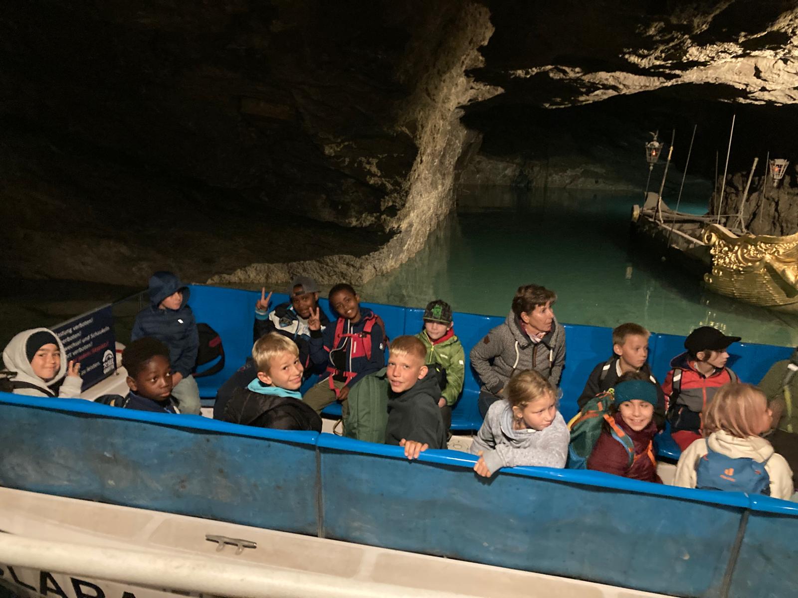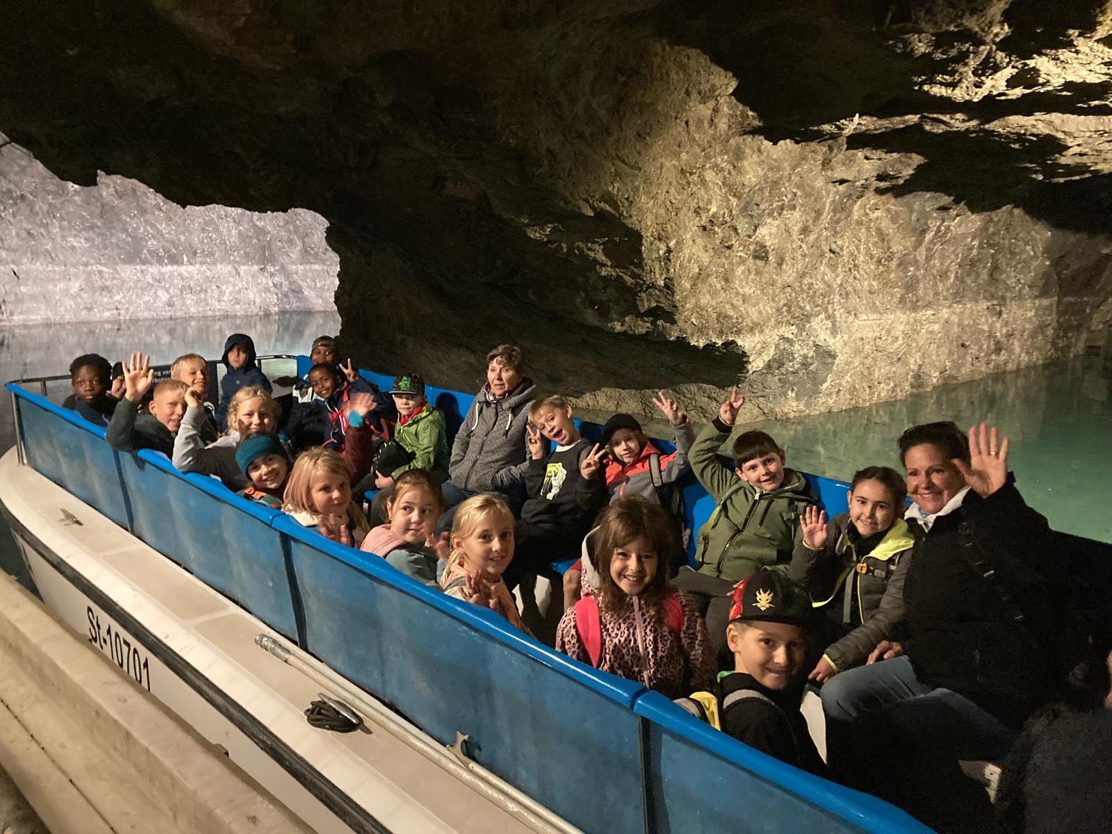 Bei angenehmem Herbstwetter marschierten wir über den Kalenderberg los. Bei der Seegrotte wurden wir Kinder der 3a und 3c bereits erwartet. Zuerst mussten wir einen langen Gang in den Berg spazieren. Es wurde immer kälter und wir waren froh, dass wir warme Jacken und Hauben dabei hatten. Es war auch sehr beeindruckend zu sehen, unter welchen Bedingungen damals die Bergleute, aber auch Pferde arbeiten mussten. Manche Tiere bekamen das Tageslicht nie zu sehen. Das absolute Highlight war natürlich die Bootsfahrt auf dem unterirdischen See.