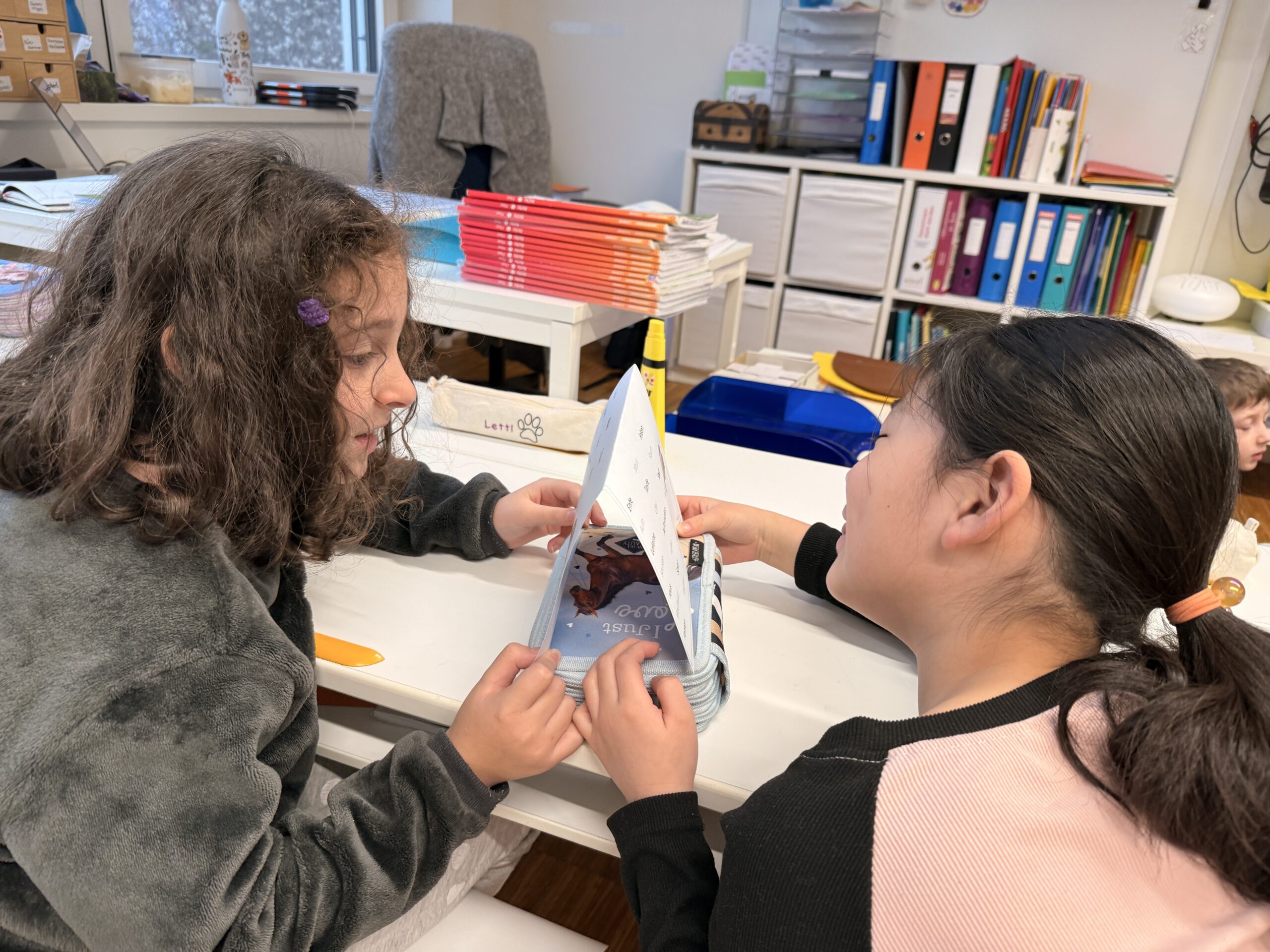 Auch beim Lesen wird fleiĂig geĂŒbt. Gemeinsam werden Buchstaben entdeckt, Wörter zusammengesetzt und erste kleine Texte gelesen. Mit viel Mut, gegenseitiger UnterstĂŒtzung und einer groĂen Portion Stolz wachsen die LesefĂ€higkeiten der Kinder von Tag zu Tag.