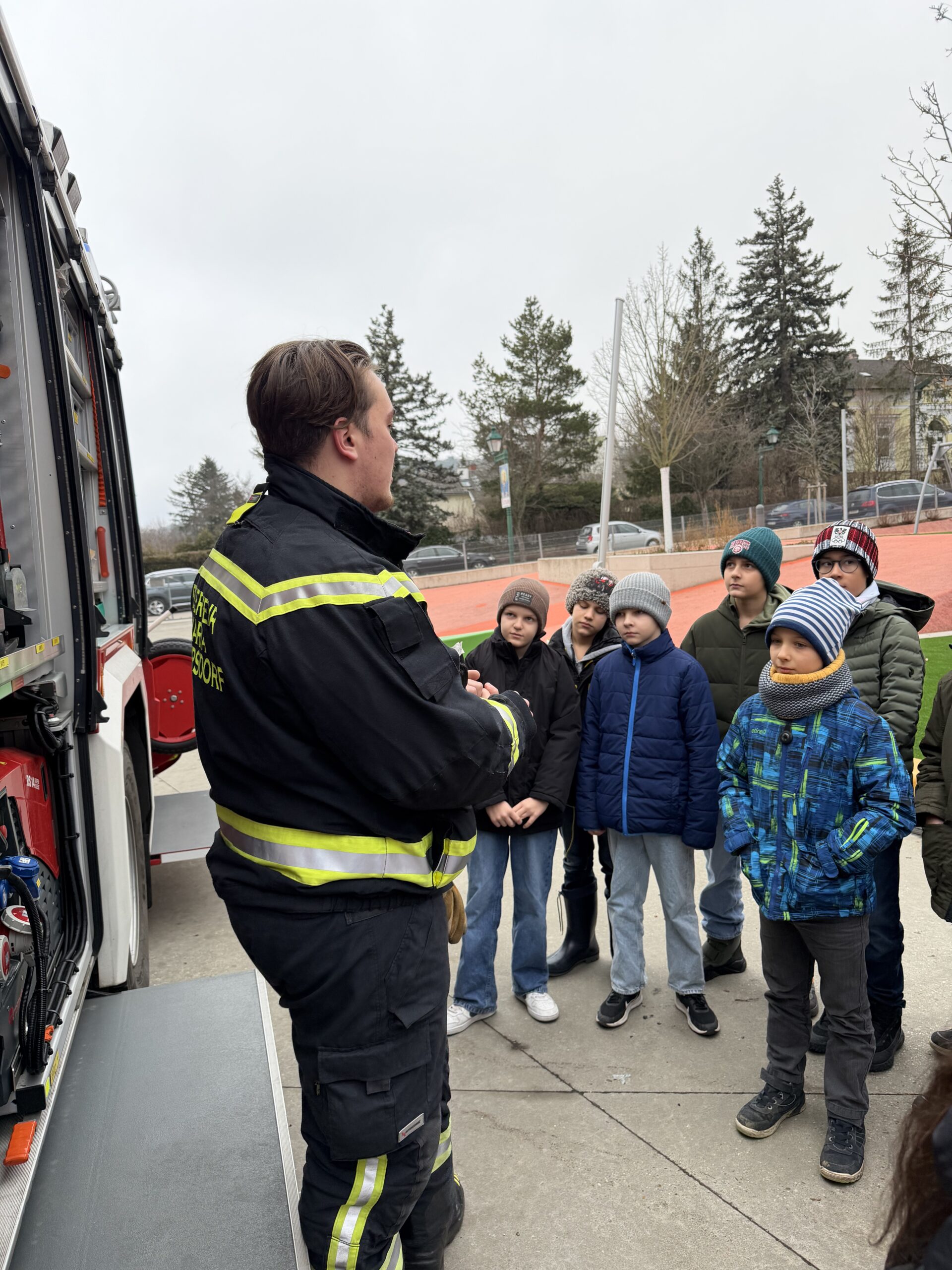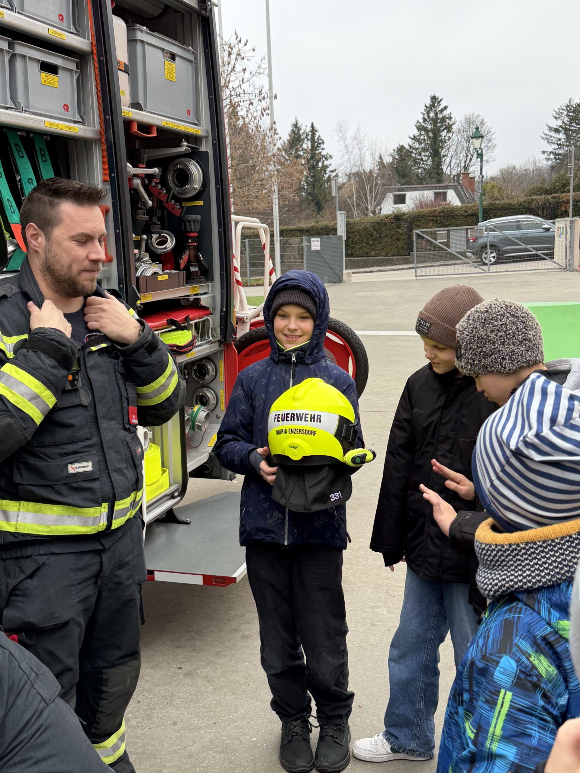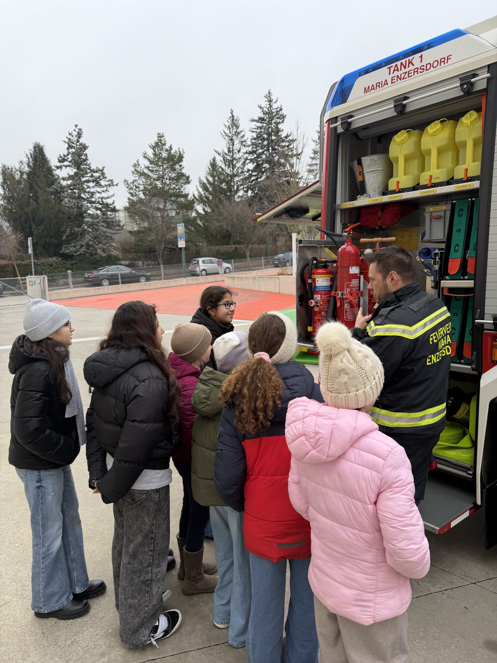 Die Feuerwehr María Enzersdorf besuchte mit einem Feuerwehrauto die vierten Klassen in der Schule. Die Feuerwehrleute erklärten ihre Schutzkleidung und warum sie so wichtig ist. Danach zeigten sie das Feuerwehrauto und die Geräte darin. Außerdem erklärten sie, was bei einem Einsatz passiert: Nach einem Notruf fahren die Feuerwehrleute schnell los und helfen Menschen, löschen Brände oder retten Tiere.