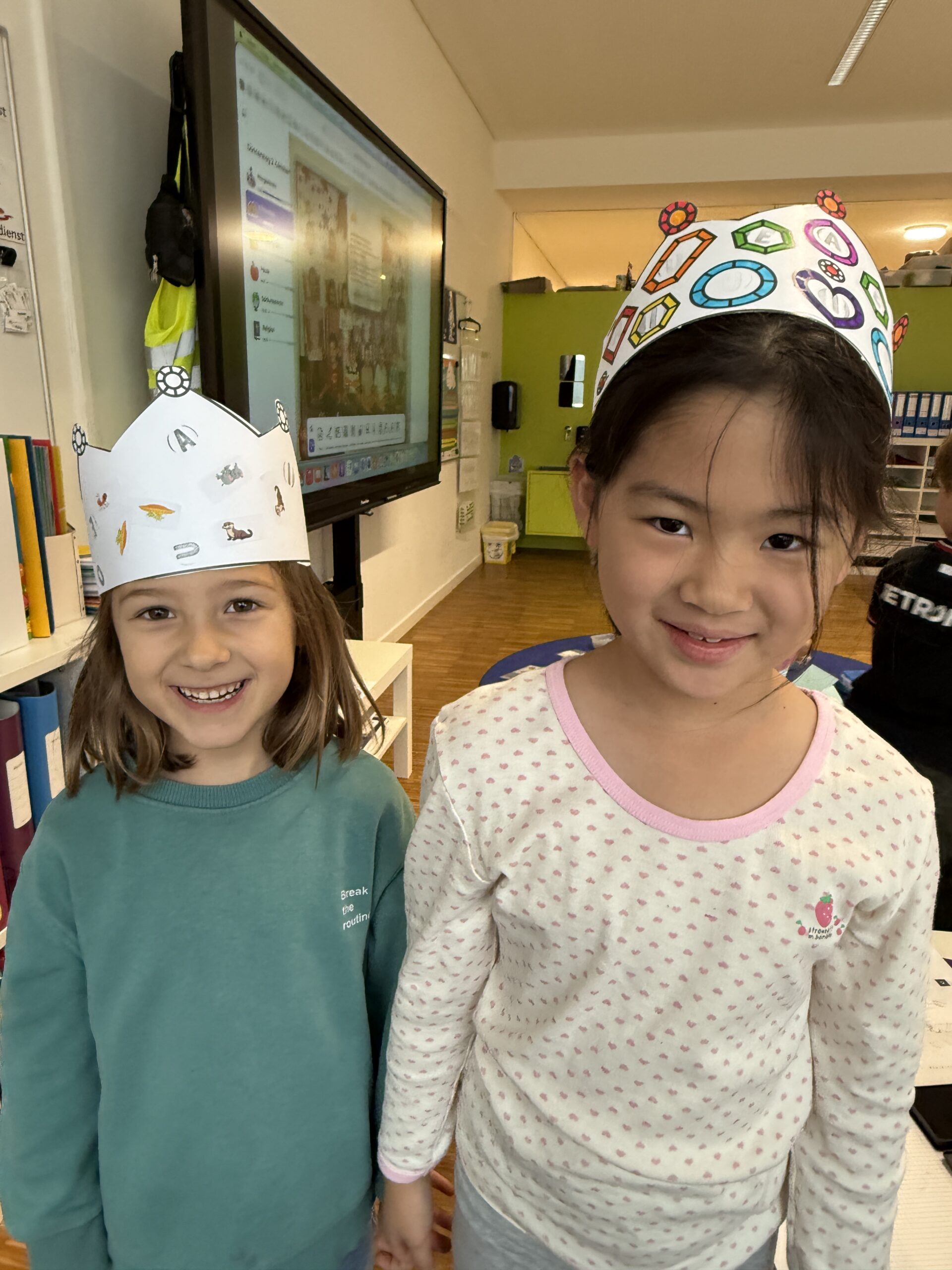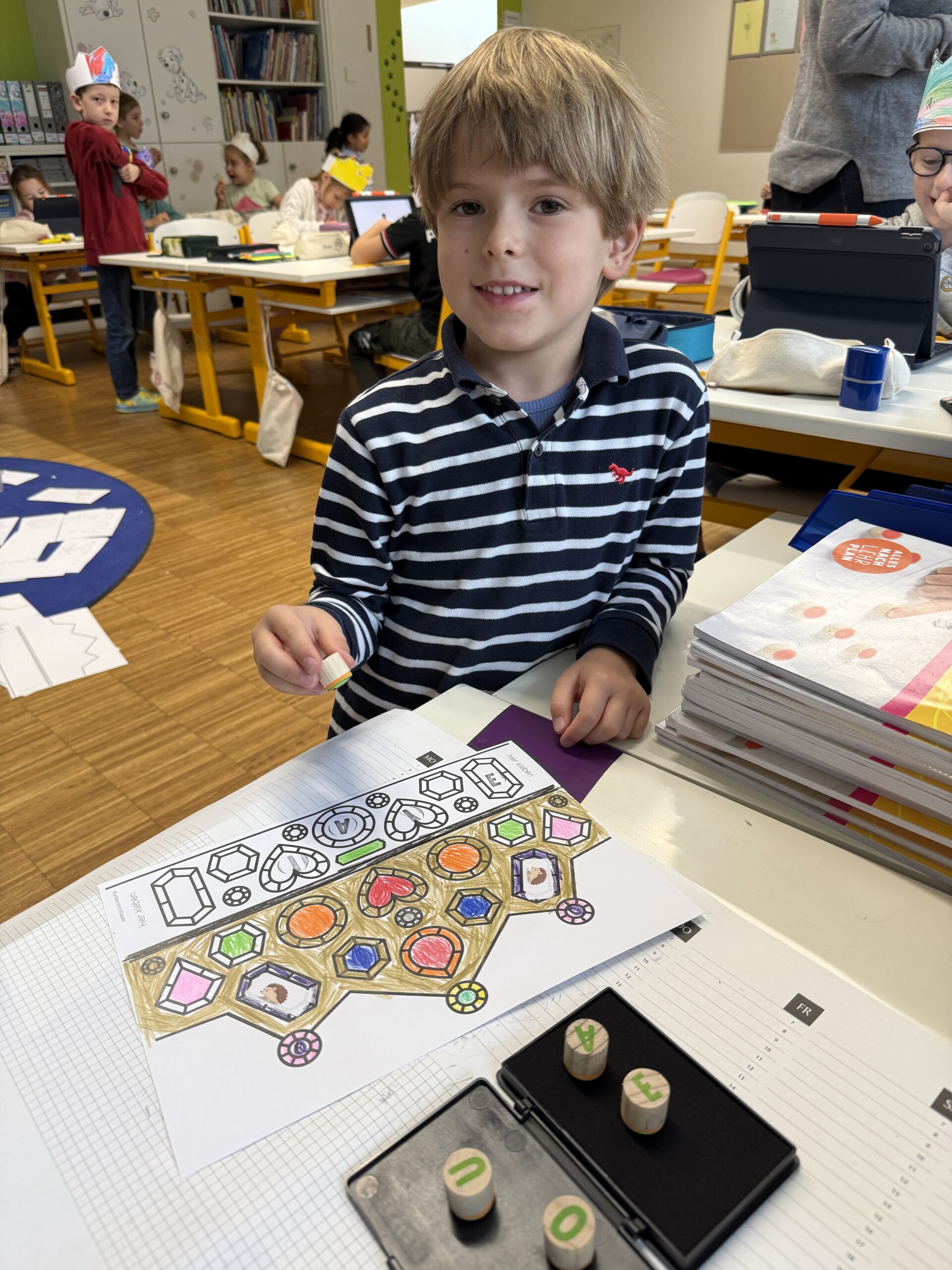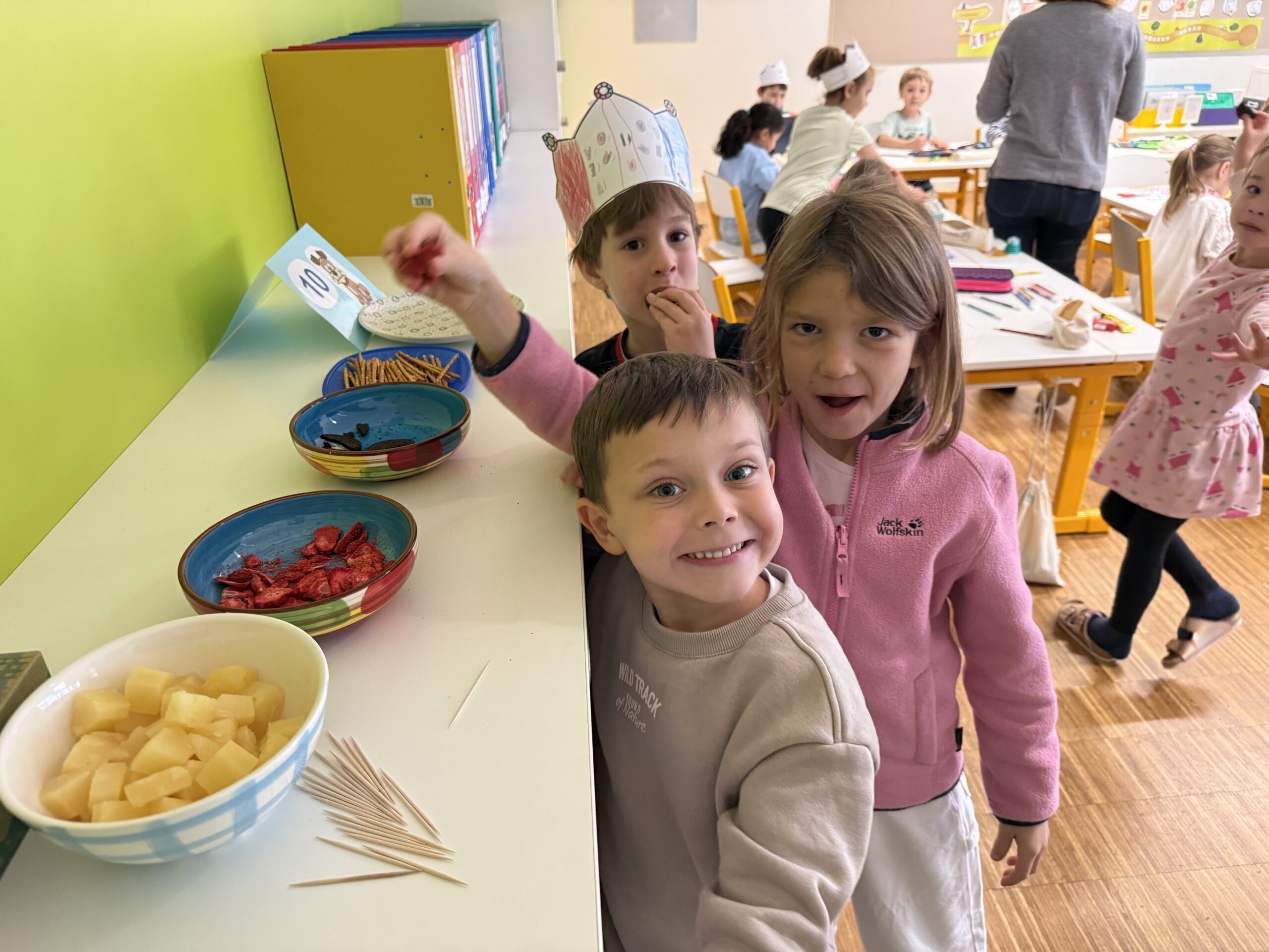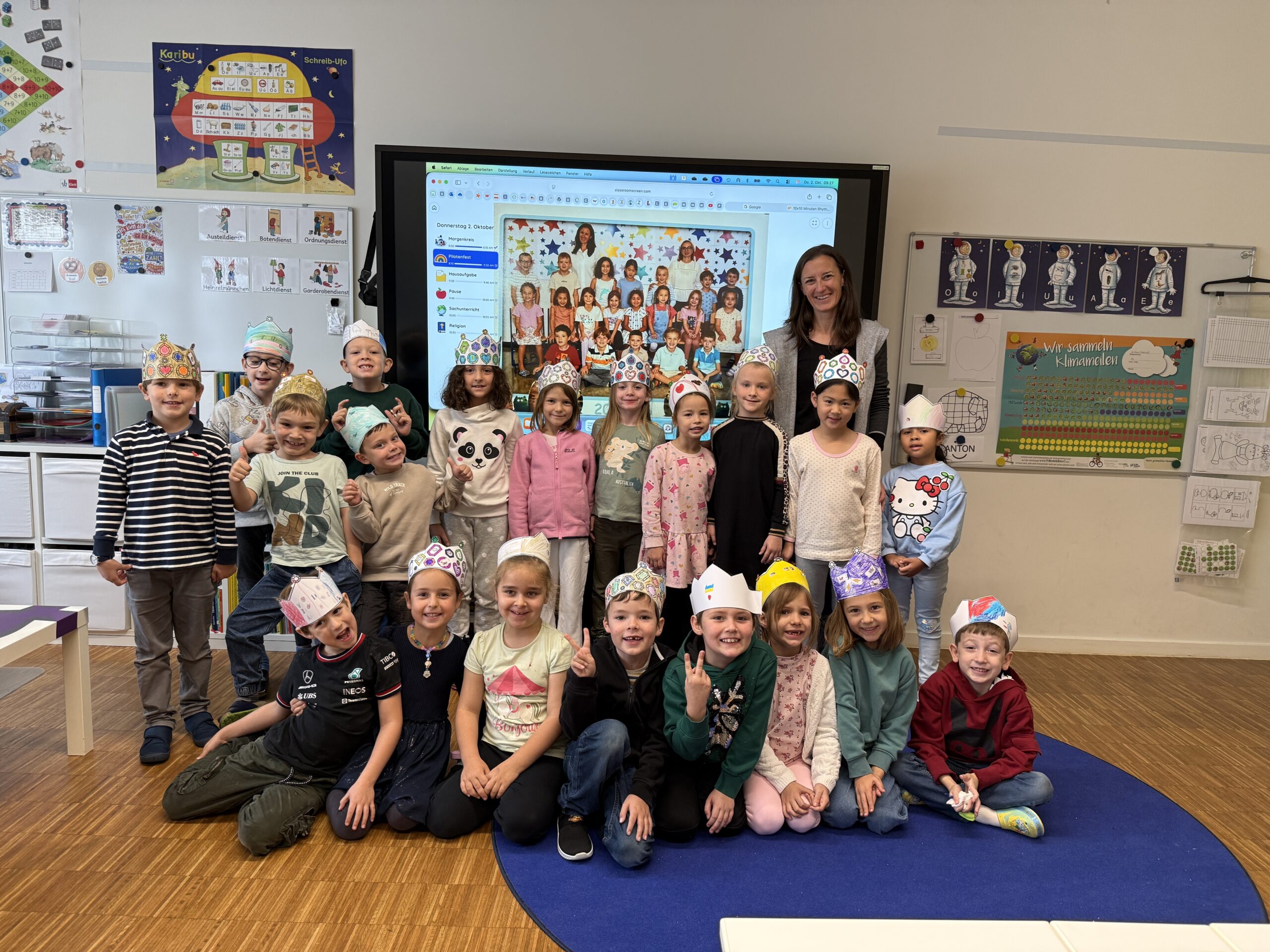 Heute feierte die 1B ein ganz besonderes Fest: Wir haben nun alle Selbstlaute – unsere „Piloten“ – gelernt! Dieses Ereignis würdigten wir mit einem fröhlichen Pilotenfest. Die Kinder bastelten bunte Kronen, prickelten Buchstaben und konnten am iPad arbeiten. Auch für leckere Stärkung war gesorgt: Es gab Ananas, Erdbeeren, Oreos und Ufos zum Naschen. Ein gelungener Tag, an dem Lernen und Feiern wunderbar zusammenpassten!