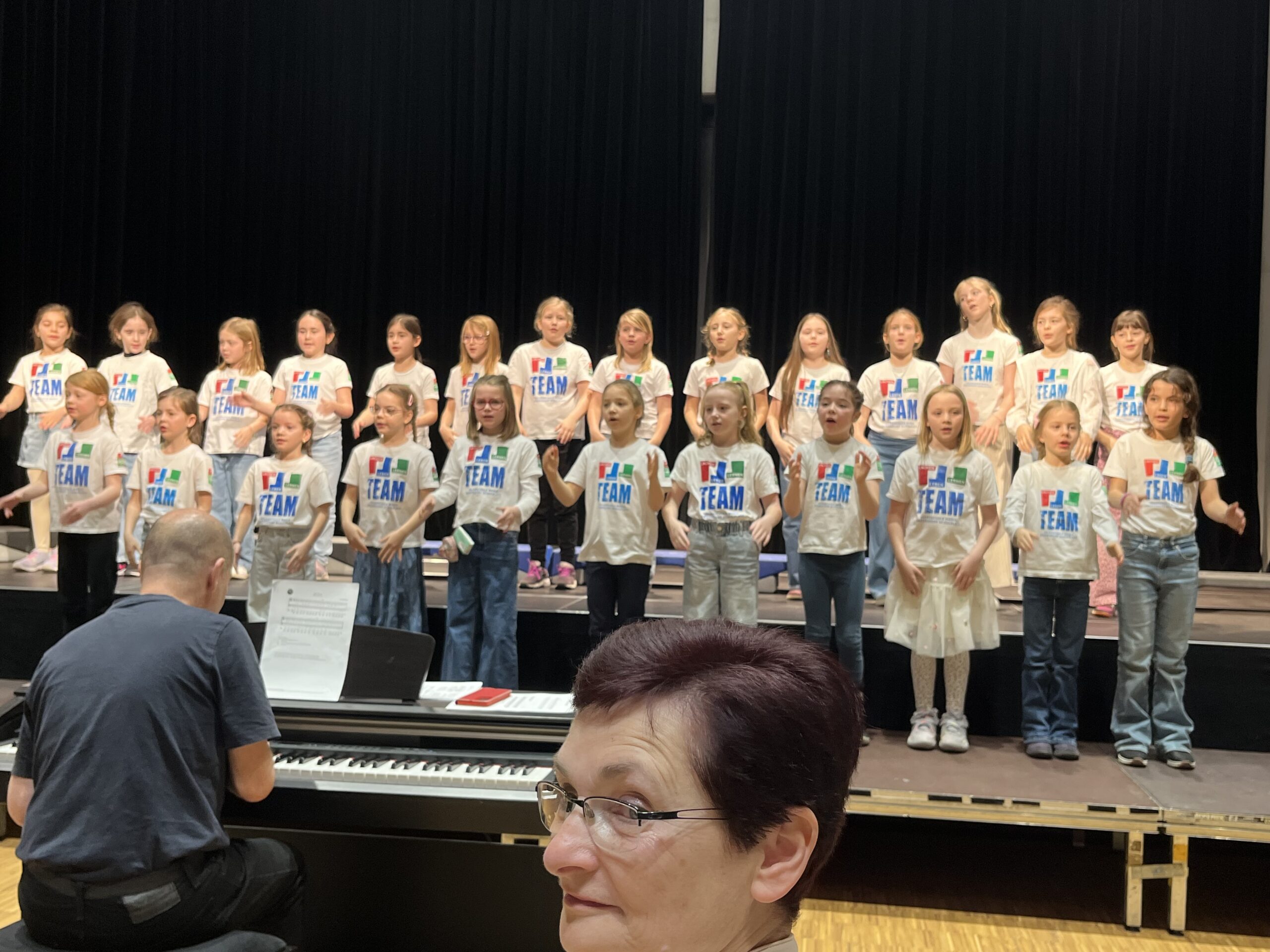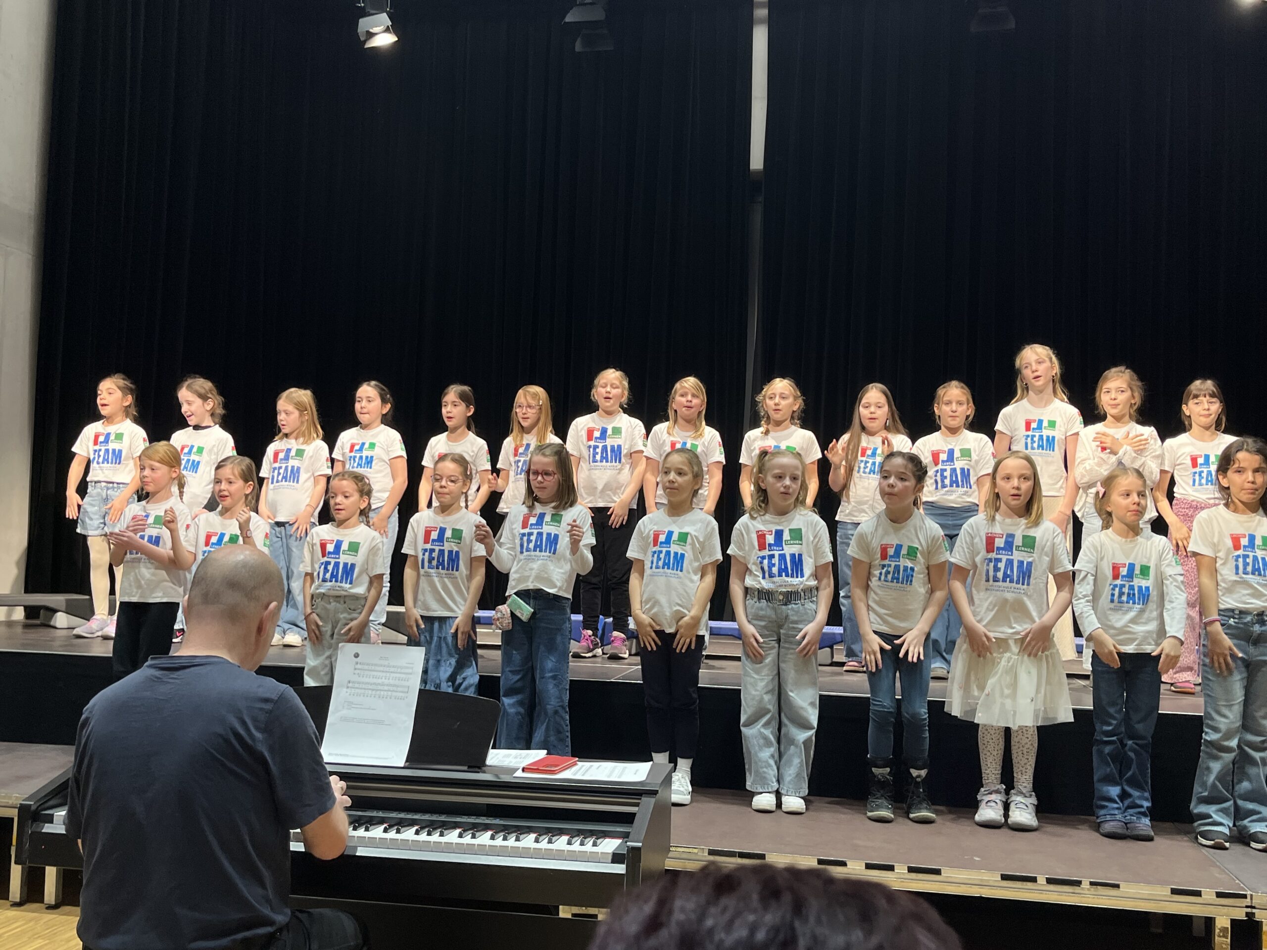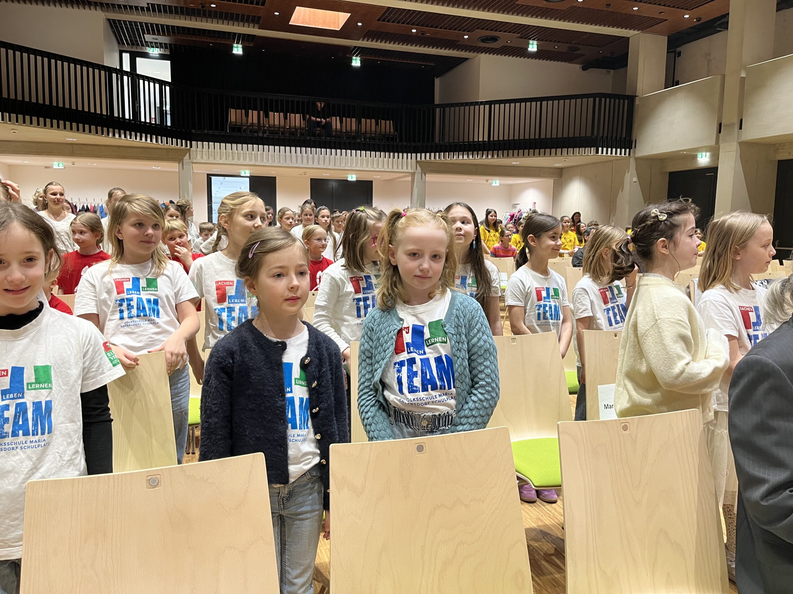 Am 24. März hatte der Schulchor einen aufregenden Tag: Die insgesamt 25 Mädchen aus den 2.-4. Klassen nahmen am Bezirksjugendsingen der Volksschulen teil. Das große gemeinsame Konzert findet nur alle 3 Jahre statt, heuer in der nagelneu erbauten Veranstaltungshalle in Gumpoldskirchen. Insgesamt 7 Schulchöre aus unserem Bezirk waren diesmal dabei und gaben jeweils 2-3 Lieder zum Besten; zwischendurch wurden auch gemeinsame Lieder mit allen