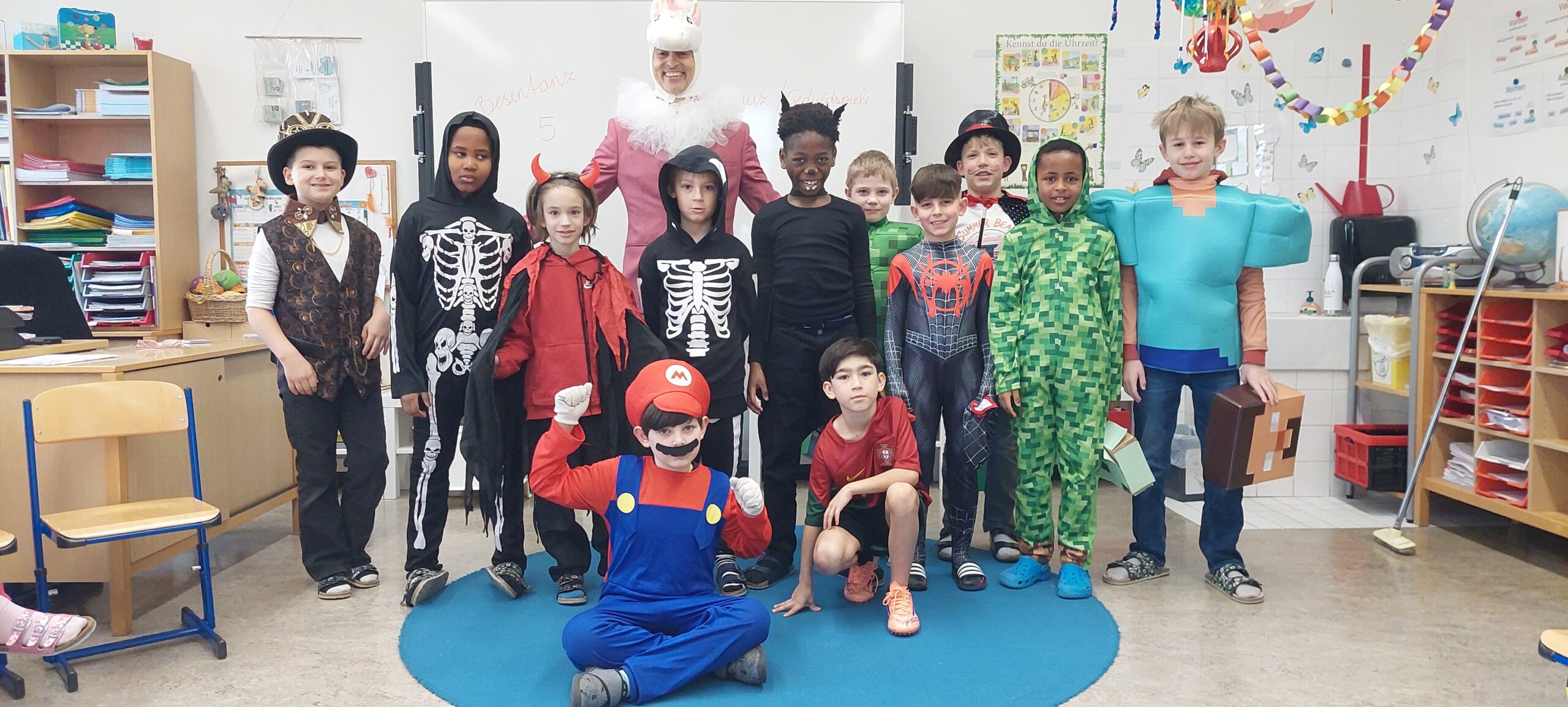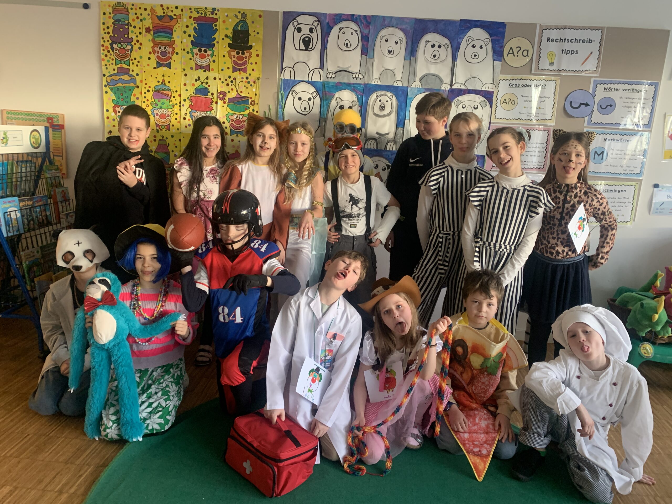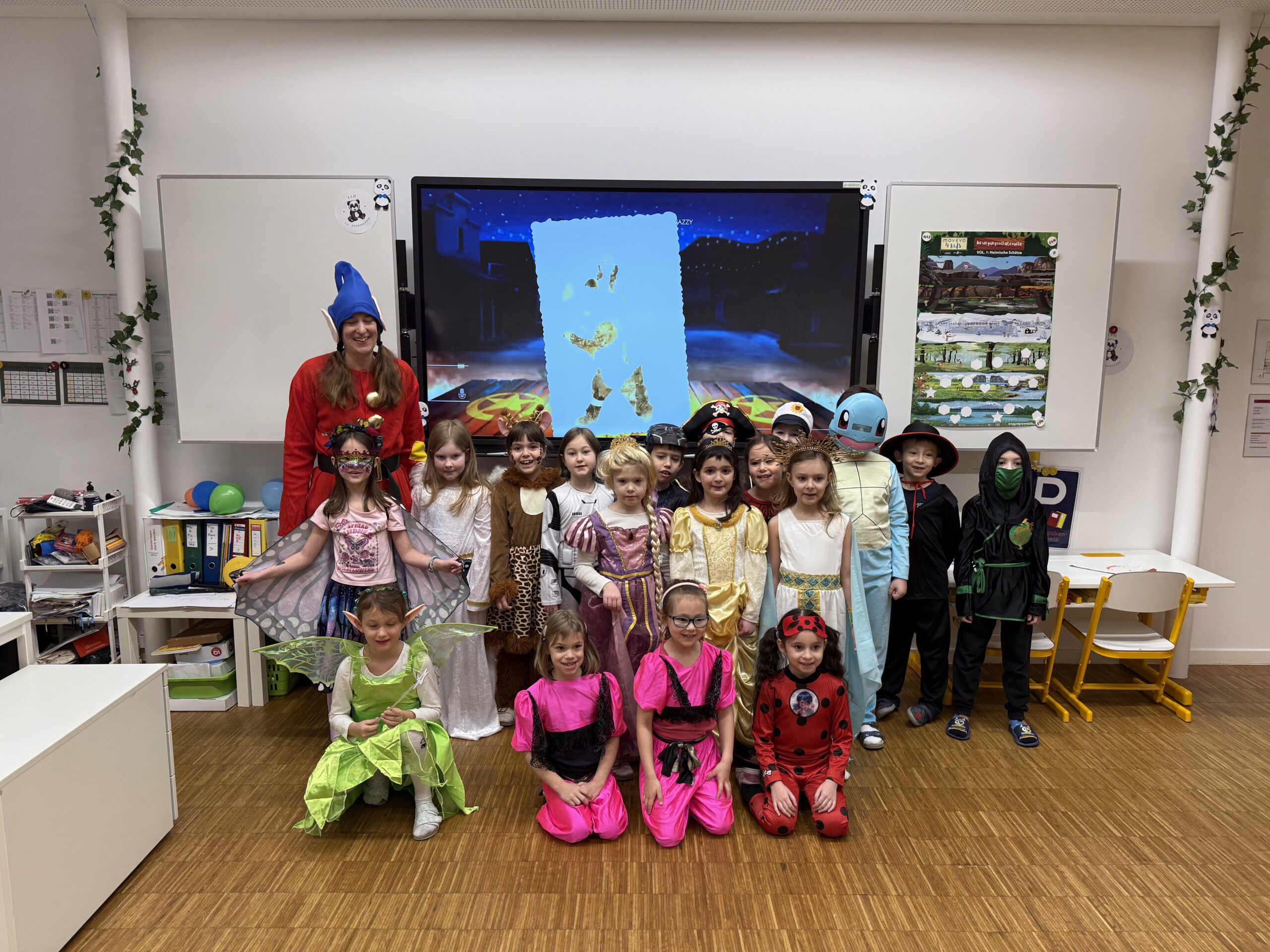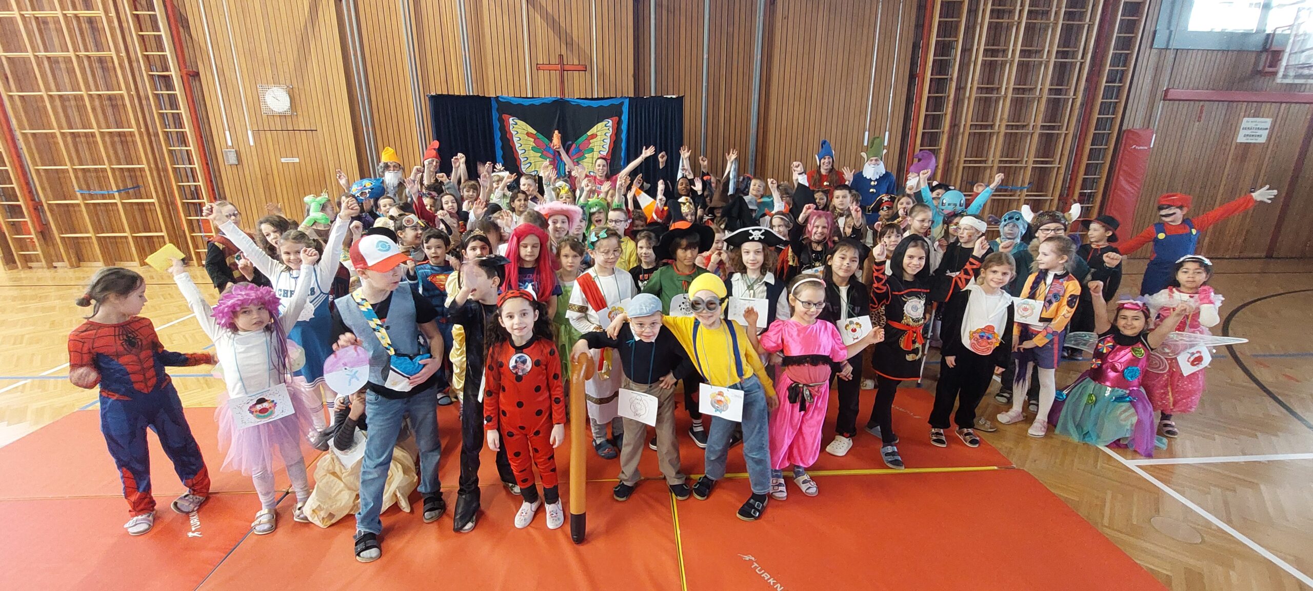 Heute wurde es in unserer Schule richtig bunt und fröhlich – wir feierten gemeinsam unser Faschingsfest! Schon am Morgen strömten die Kinder in den unterschiedlichsten und lustigsten Verkleidungen ins Schulhaus. Man konnte bekannte Figuren wie Super Mario, Harry Potter und Stitch entdecken. Außerdem begegnete man zauberhaften Feen, mutigen Piraten, süßen Katzen und vielen weiteren fantasievollen Kostümen.